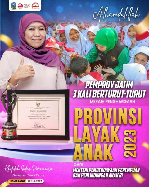 Penghargaan Jatim Provinsi Layak Anak tahun 2023 ini diserahkan oleh Menteri Pemberdayaan Perempuan dan Perlindungan Anak (PPPA) RI I Gusti Ayu Bintang Darmawanti kepada Gubernur Jawa Timur Khofifah Indar Parawansa yang diwakili Sekdaprov Jatim Adhy Karyono pada Penghargaan Apresiasi Kabupaten/Kota Layak Anak (KLA) Tahun 2023 di Hotel Padma Semarang, Sabtu (22/7) malam.