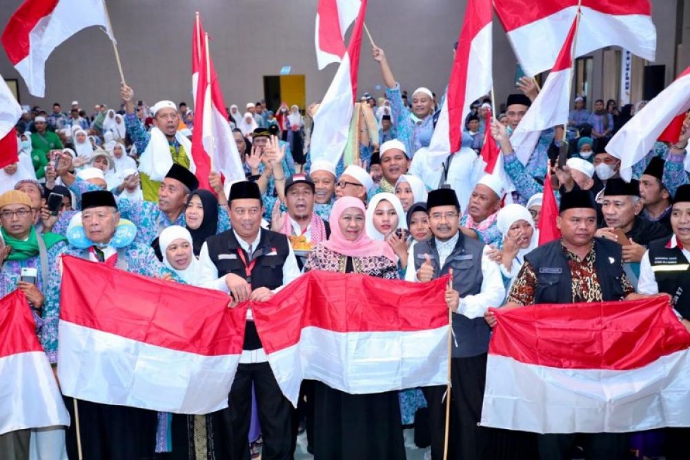 " _Monggo_ sesampainya dirumah bisa dikibarkan benderanya agar berkah untuk Jawa Timur, berkah untuk Indonesia senantiasa berseiring berkah yang dibawa dari Tanah Suci. Terlebih, _panjenengan_ semua ini kepulangannya dibersamai para malaikat . Doakan Jatim dan Indonesia barokah sekaligus aman, tenteram, dan bahagia sejahtera," ungkapnya.
