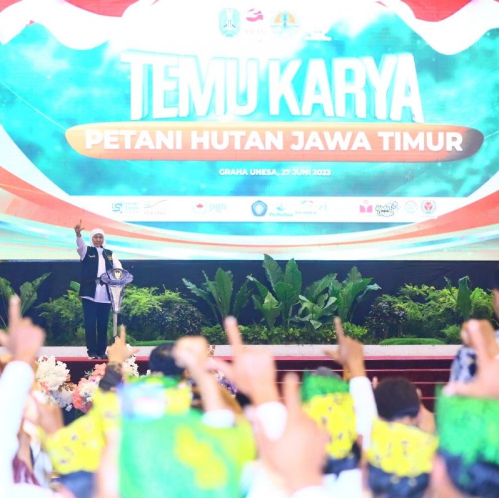 Gubernur Khofifah sampaikan sambutan dalam acara Temu Karya petani hutan. (Ist)