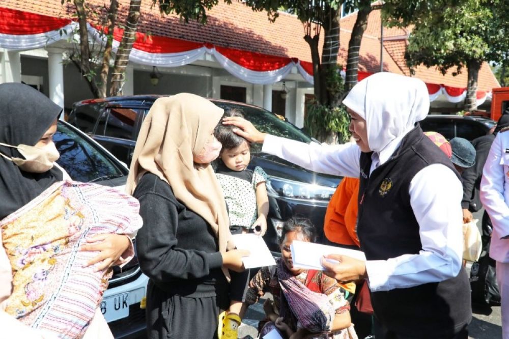 SURABAYA | B-news.id - Gubernur Jawa Timur Khofifah Indar Parawansa berbagi bersama Pedagang Kaki Lima (PKL) dan masyarakat kurang mampu di halaman timur Gedung Negara Grahadi, Surabaya, Jumat (18/8) sore.