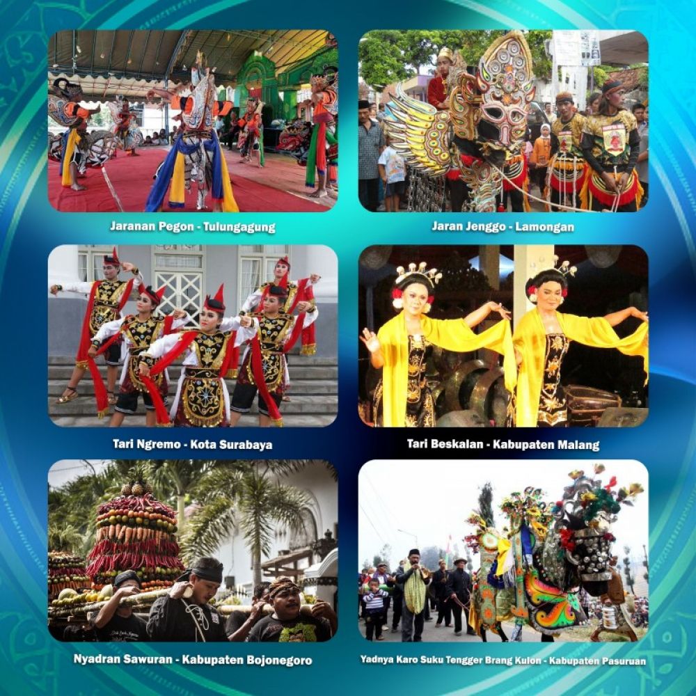 Rincian 12 karya budaya Jatim yang diakui sebagai WBTb nasional adalah Jaranan Pegon dari Tulungagung, Jaran Jenggo dari Kab. Lamongan, Tari Ngremo Surabayan dari Kota Surabaya, Tari Beskalan dari Kab. Malang, Nyadran Sawuran dari Kab. Bojonegoro dan Yadnya Karo Suku Tengger Brang Kulon dari Kab. Pasuruan.