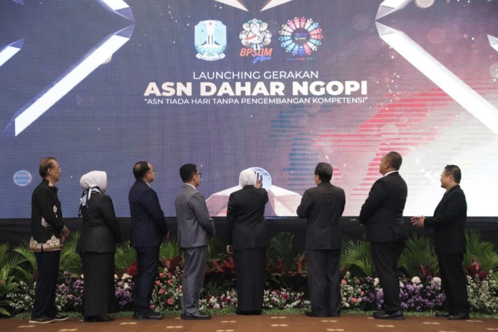 SURABAYA | B-news.id - Gubernur Jawa Timur Khofifah Indar Parawansa meluncurkan gerakan 'Dahar Ngopi' yang merupakan akronim dari Tiada Hari Tanpa Pengembangan Kompetensi. Peluncuran yang ditandai dengan penekanan tombol di layar LED ini dilakukan di Gedung Sasana Wiyata Praja, Kantor BPSDM Provinsi Jatim, Kamis (14/9).