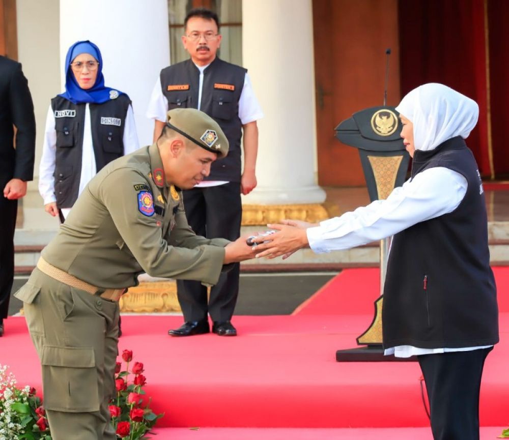 Kasatpol PP Jatim, M Hadi Wawan Guntoro usai melaporkan kegiatan Kirab Pataka kepada Gubernur Jatim Khofifah Indar parawansa. (Ist)