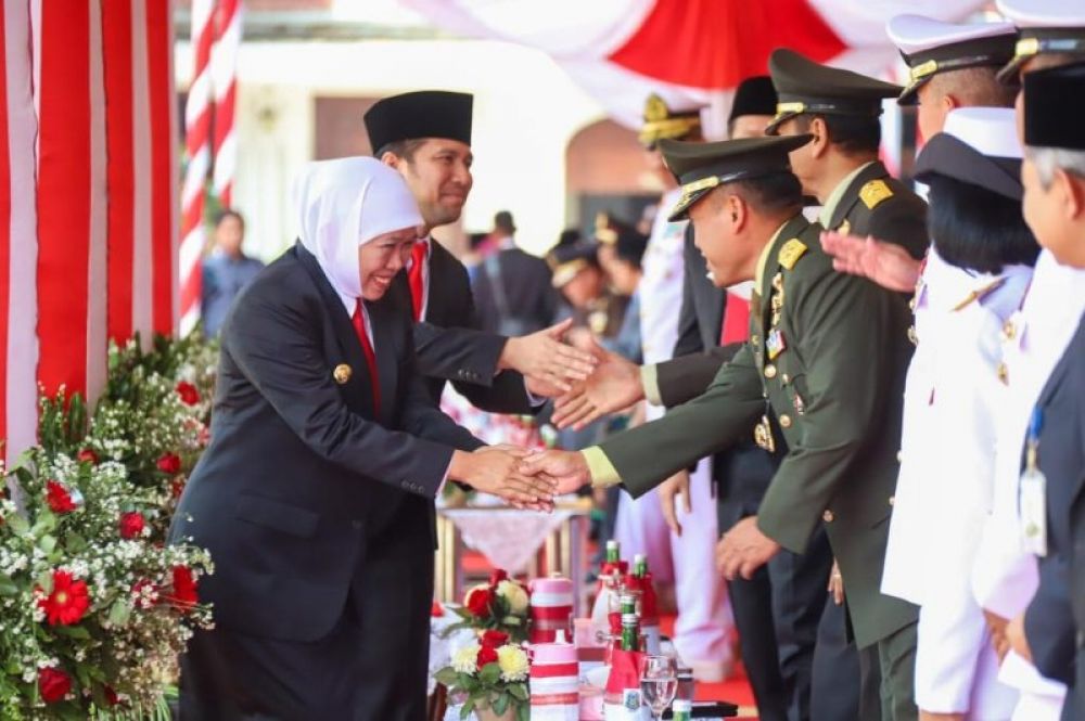 Gubernur Khofifah bersama, Wahub Emil Dardak menghadiri upacara Hari Kesaktian Pancasila menyalami tamu yang hadir. (Ist)