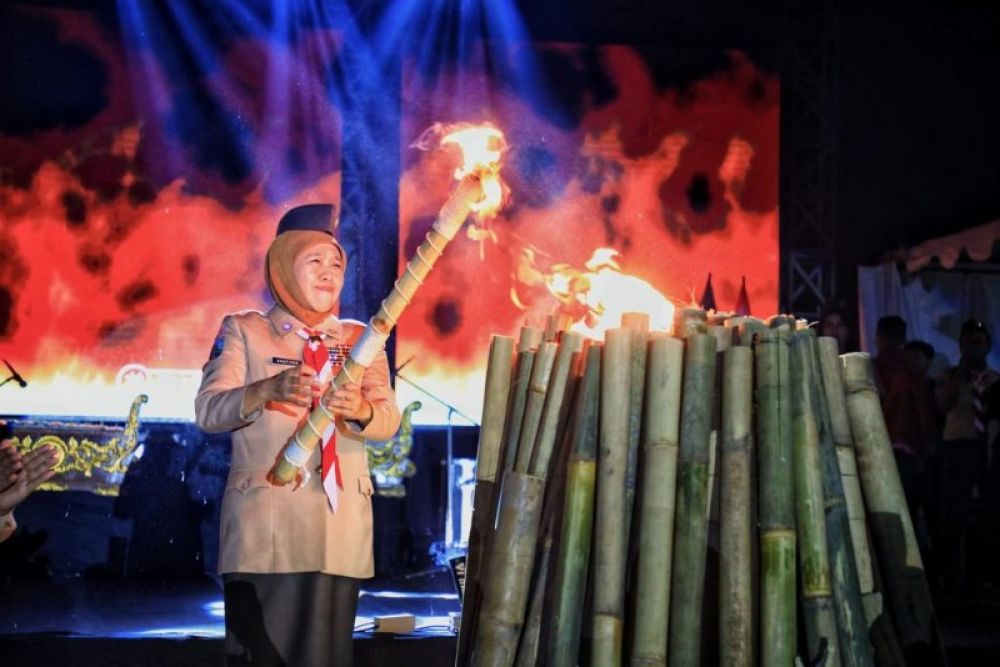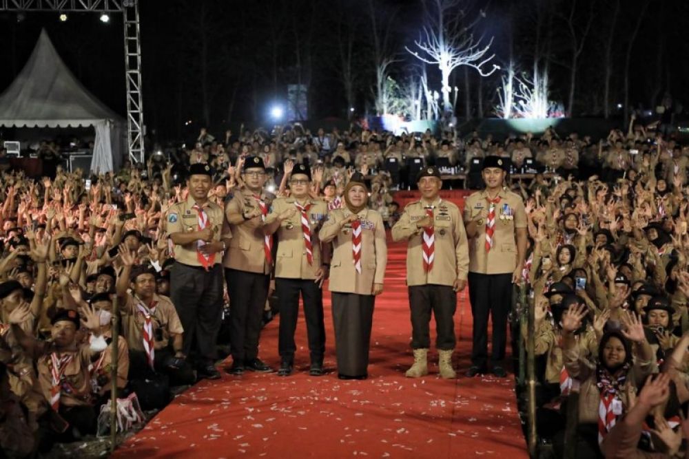 KAB. TUBAN | B-news.id - Gubernur Jawa Timur Khofifah Indar Parawansa selaku Ketua Majelis Pembimbing Daerah (Mabida) Gerakan Pramuka Kwartir Daerah Jatim membuka secara langsung Jambore Daerah Provinsi Jatim Tahun 2023 di Bumi Perkemahan Ngawun Abilowo, Parengan, Kab. Tuban, Senin (2/10) malam.