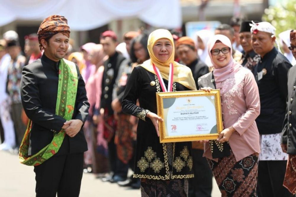 Serahkan penghargaan kepada Bupati Blitar Rini Syarifah. (Ist)