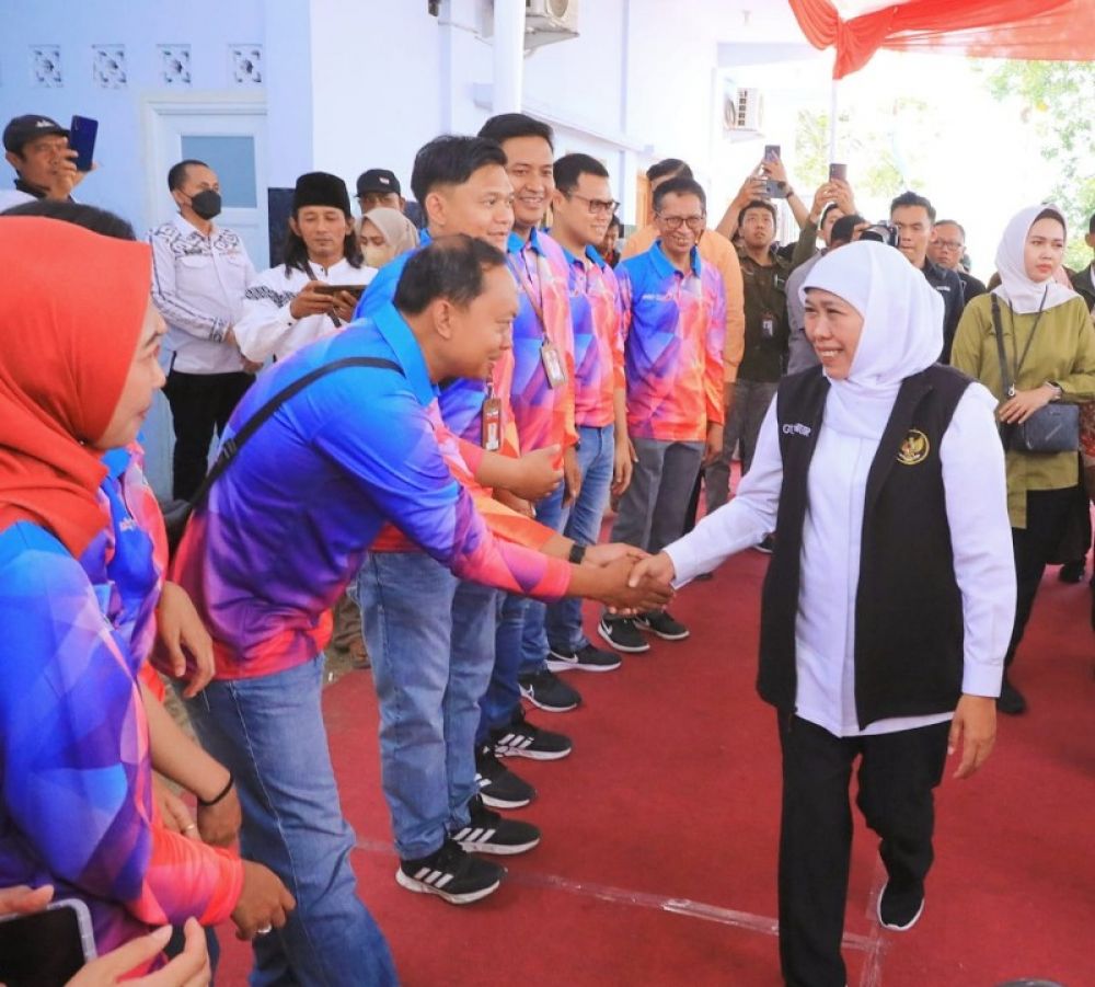 Gubernur Khofifah saat menyalami pegawai bank Jatim. (Ist)