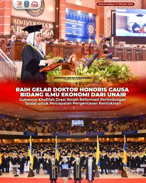 SURABAYA | B-news.id - Gubernur Jawa Timur Khofifah Indar Parawansa mendapat anugerah gelar Doktor Honoris Causa (HC UA) Bidang Ilmu Ekonomi dari Fakultas Ekonomi dan Bisnis Universitas Airlangga (Unair) di Airlangga Convention Center, Kampus C Unair Surabaya, Minggu (15/10).