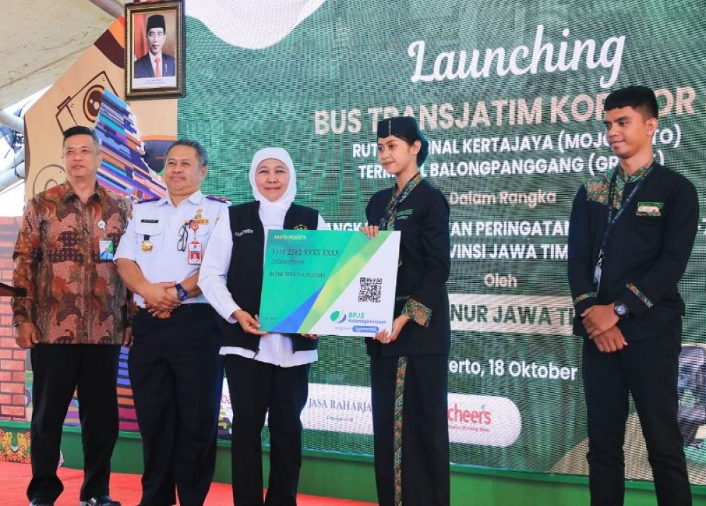 Dalam kesempatan ini, Gubernur Khofifah turut menyerahkan secara simbolis Jaminan Ketenagakerjaan kepada Petugas Trans Jatim didampingi Ka. Dishub Prov. Jatim dan BPJS Ketenagakerjaan. (zainul)