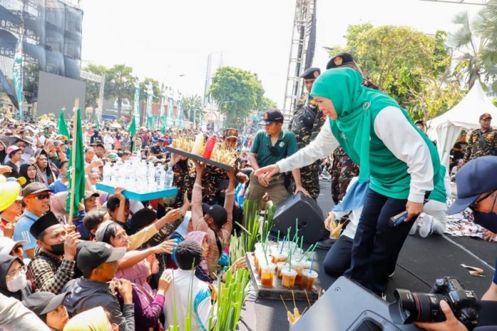 Gubernur Khofifah membagikan minuman kepada peserta. (Ist)