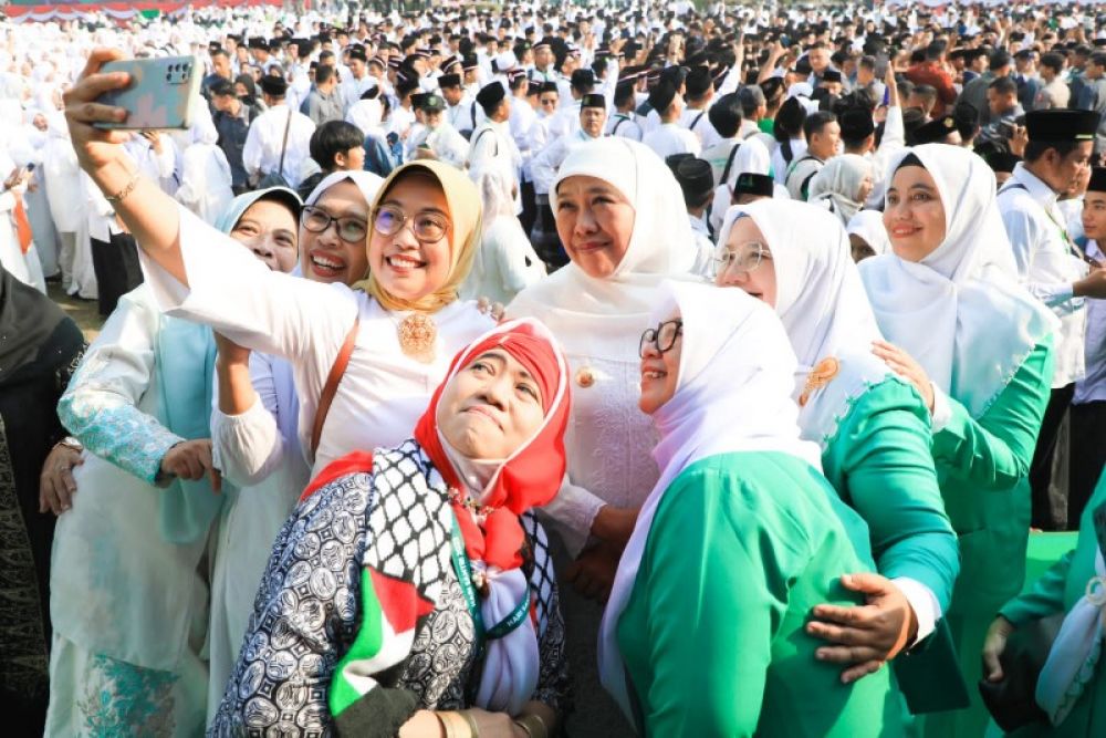 Gubernur Khofifah selfi dengan para jamaah saat hadiri peringatan Hari Santri Nasional di Surabaya. (Ist)