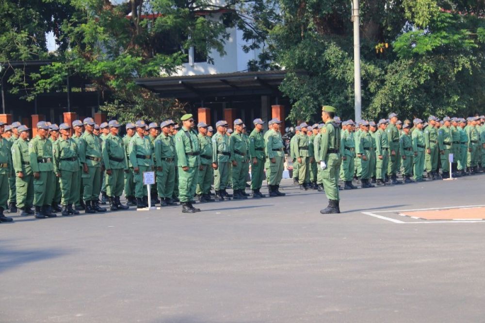 Tampak Satlinmas saat Apel Kesiapan Anggota jelang Pemilu serentak 2024 di Halaman Pemkab Mojokerto. (ist)