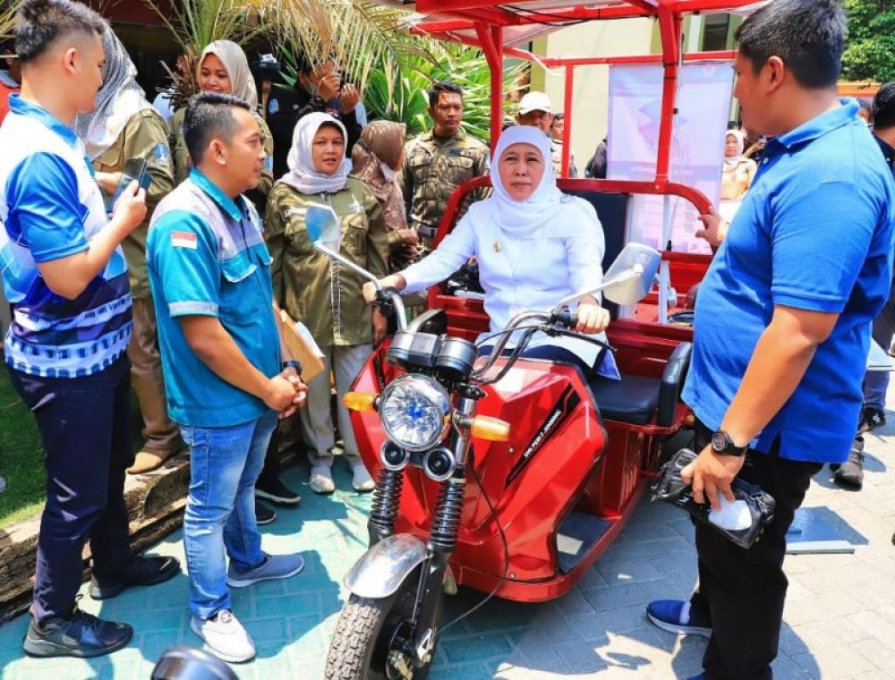 Gubernur Khofifah menjajal motor konversi listrik hasil karya, SMK Jatim. (Ist)