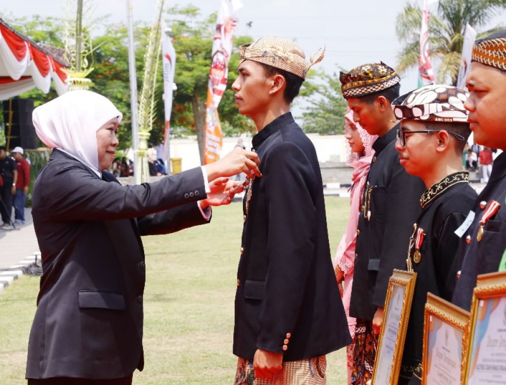 Kemudian, Gubernur Khofifah menyematkan PIN, menyerahkan piagam penghargaan serta uang pembinaan Rp 10.000.000 kepada 7 pemuda.