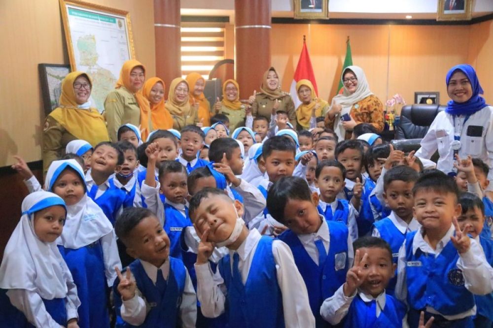 Bupati Ikfina bersama siswa-siswi TK Negeri Pembina I Sooko di ruang kerja Bupati Mojokerto. (ist)