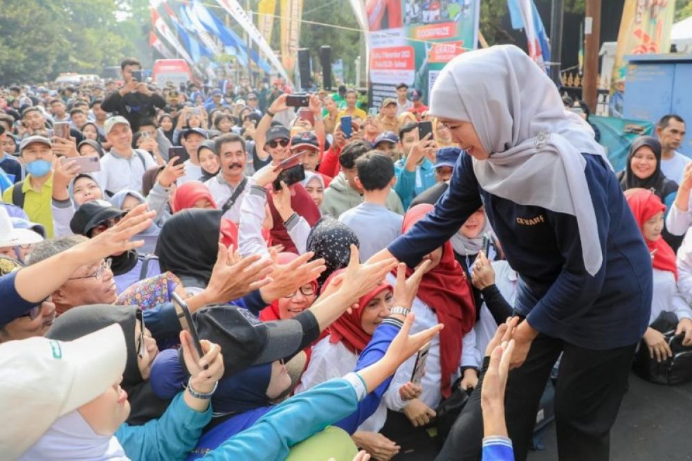 Tak hanya memberangkatkan peserta, Gubernur Khofifah pun turut bergabung dengan ribuan masyarakat dan berjalan melintasi rute yang disiapkan. Sepanjang jalan, ia juga tampak dengan senang hati dan antusias menyapa dan melayani satu persatu masyarakat yang mengajak berswa foto.
