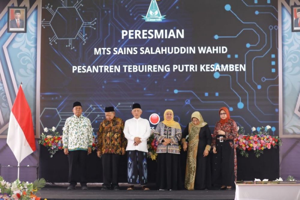Peresmian MTs Sains Salahuddin Wahid ditandai dengan penekanan tombol digital dan Penandatanganan Prasasti oleh Gubernur Khofifah didampingi Pj. Bupati Jombang Sugiat, Pengasuh Ponpes Tebuireng KH Abdul Hakim Mahfudz Perwakilan Keluarga KH Salahuddin Wahid, Nyai Hj. Farida Salahudin Wahid dan Ketua Yayasan Hasyim Asy'ari dr. Ali Faisal.