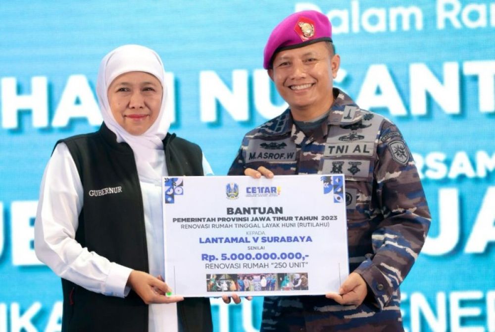 Pada kesempatan ini, Gubernur Khofifah juga menyerahkan beragam bantuan, di antaranya Hibah Pemerintah Provinsi Jawa Timur Program Rumah Tinggal Layak Huni (Rutilahu) Tahun 2023 kepada Lantamal V Surabaya senilai Rp5.000.000.000 untuk Renovasi 250 Unit Rumah.