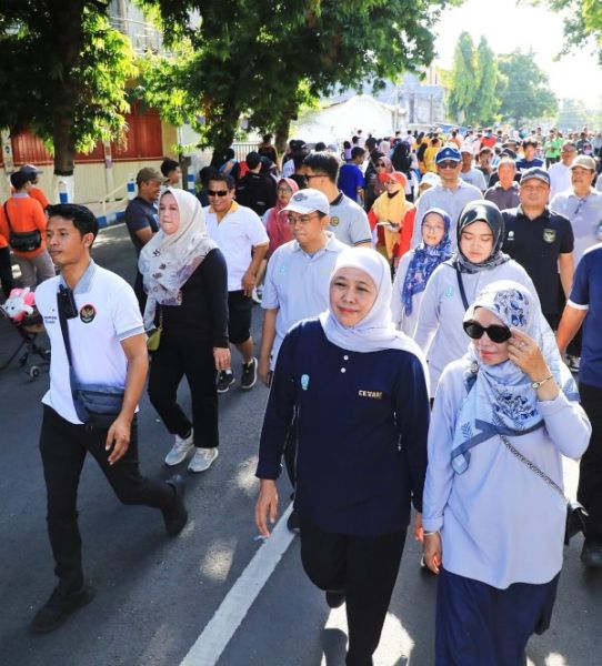 SITUBONDO | B-news.id - Gubernur Jawa Timur Khofifah Indar Parawansa membaur bersama 17 ribu peserta jalan sehat yang dihelat Pemprov Jatim dalam rangka HUT ke-78 di depan Pendopo Kabupaten Situbondo, Sabtu (16/12/2023).