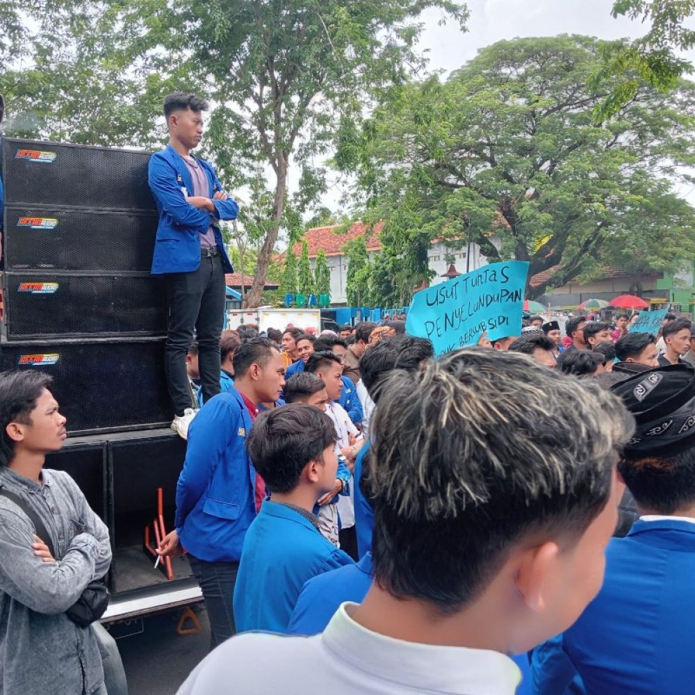 Aksi mahasiswa PMII saat berunjuk rasa di depan kantor Bupati Pamekasan menuntut kelangkasn pupuk bersubsidi. (Ist)