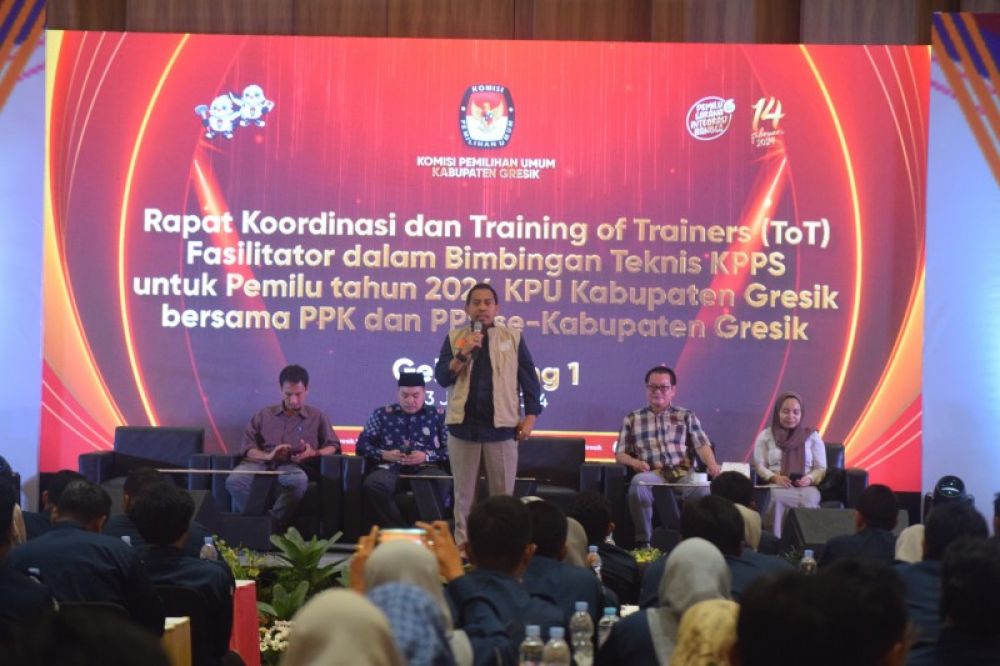GRESIK | B-news.id - Komisi Pemilihan Umum (KPU) Kabupaten Gresik melaksanakan kegiatan Rapat Koordinasi dan Training of Trainers (ToT) Fasilitator Dalam Bimbingan Teknis KPPS Untuk Pemilu tahun 2024 KPU Kabupaten Gresik bersama PPK dan PPS se-Kabupaten Gresik, di Graha Kartini, Selasa (23/01).