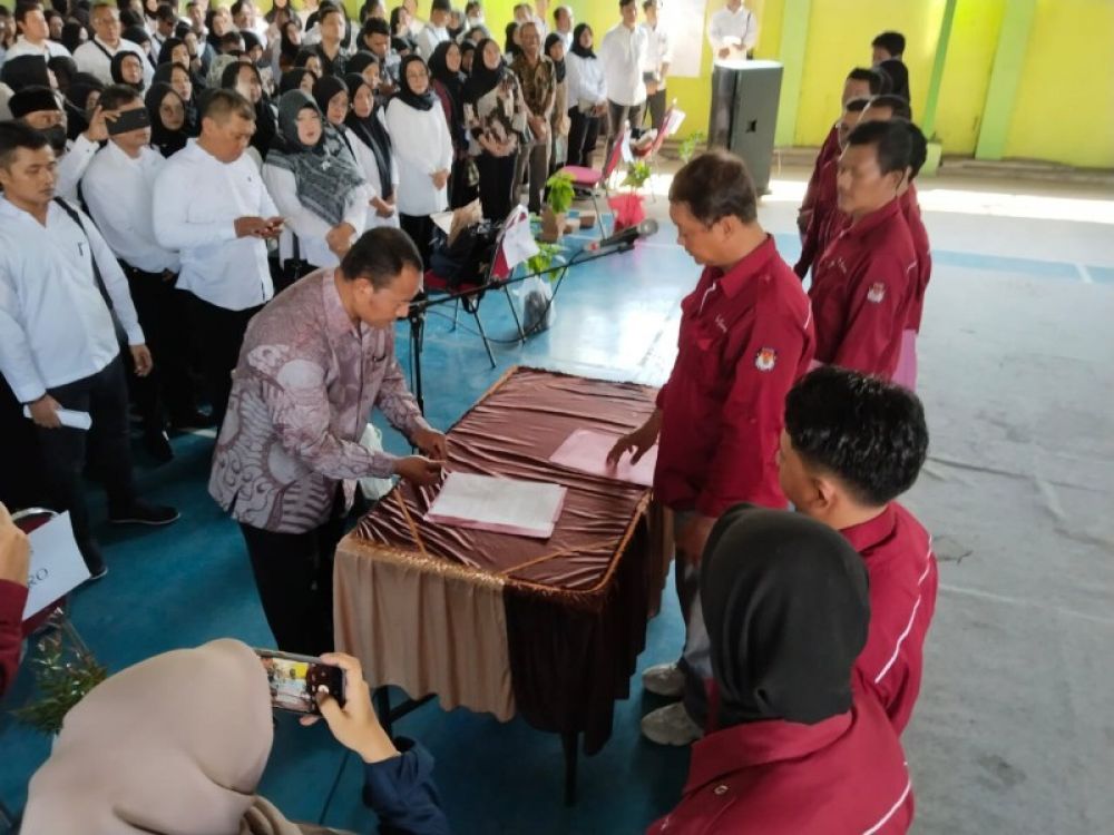 21 Ketua PPS berdiri menghadap KPPS yang bertugas di masing masing wilayah kerja PPS, mengucapkan sumpah dan janji sekaligus menanda tangani pakta integritas.