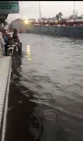 Kondisi jalan raya Waru samping jembatan layang Waru seperti laut, Pengendara motor berebut naik jalan layang Waru dan tidak berani lewat bawah. (Ist)