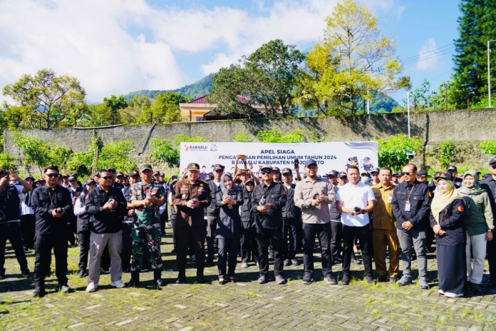 KABUPATEN MOJOKERTO | B-news.id - Bupati pimpin apel siaga Pemilu 2024 jajaran Bawaslu Kabupaten Mojokerto mulai dari Panitia Pengawas Pemilu Kecamatan (Panwascam) hingga Pengawas Pemilu Kelurahan dan Desa (PKD). Kegiatan apel siaga ini dilaksanakan di Paseban Agung Trawas Kabupaten Mojokerto pada Senin (12/2) pagi.