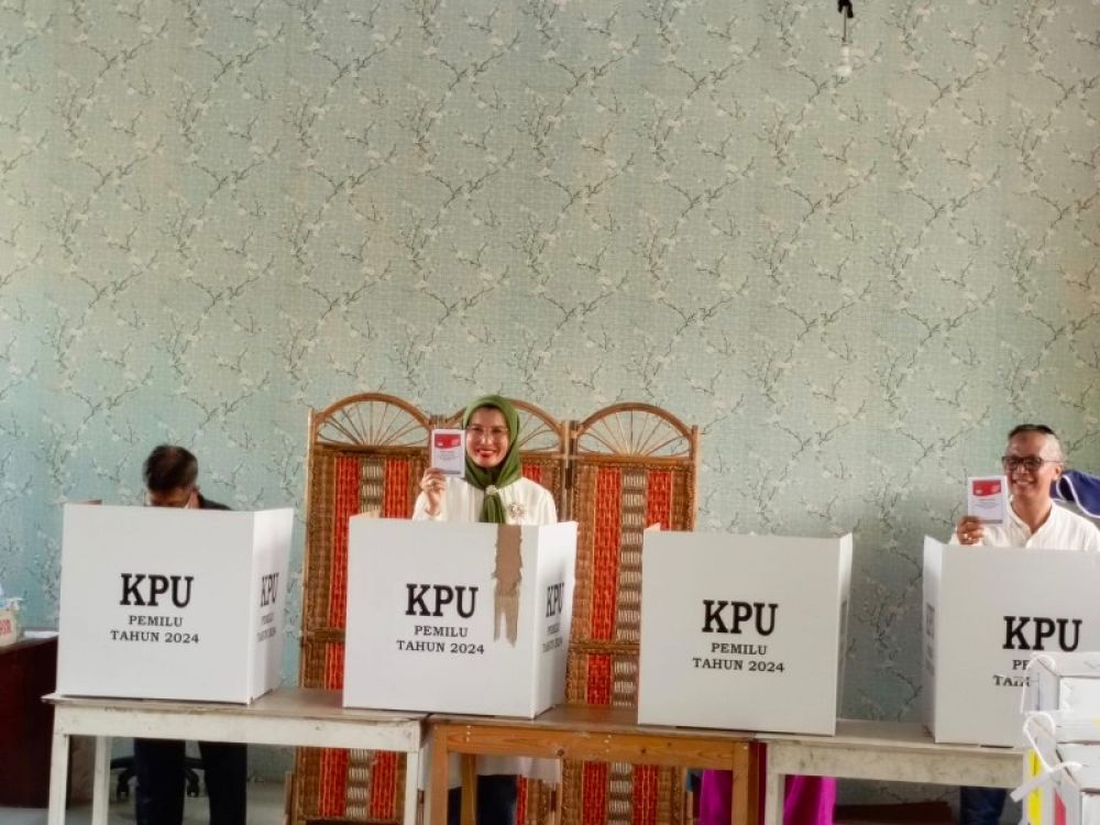 Arzeti bersama suaminya, Aditya Setiawan menunjukkan kartu suara setelah mencoblos. (foto: zainul/B-news.id)