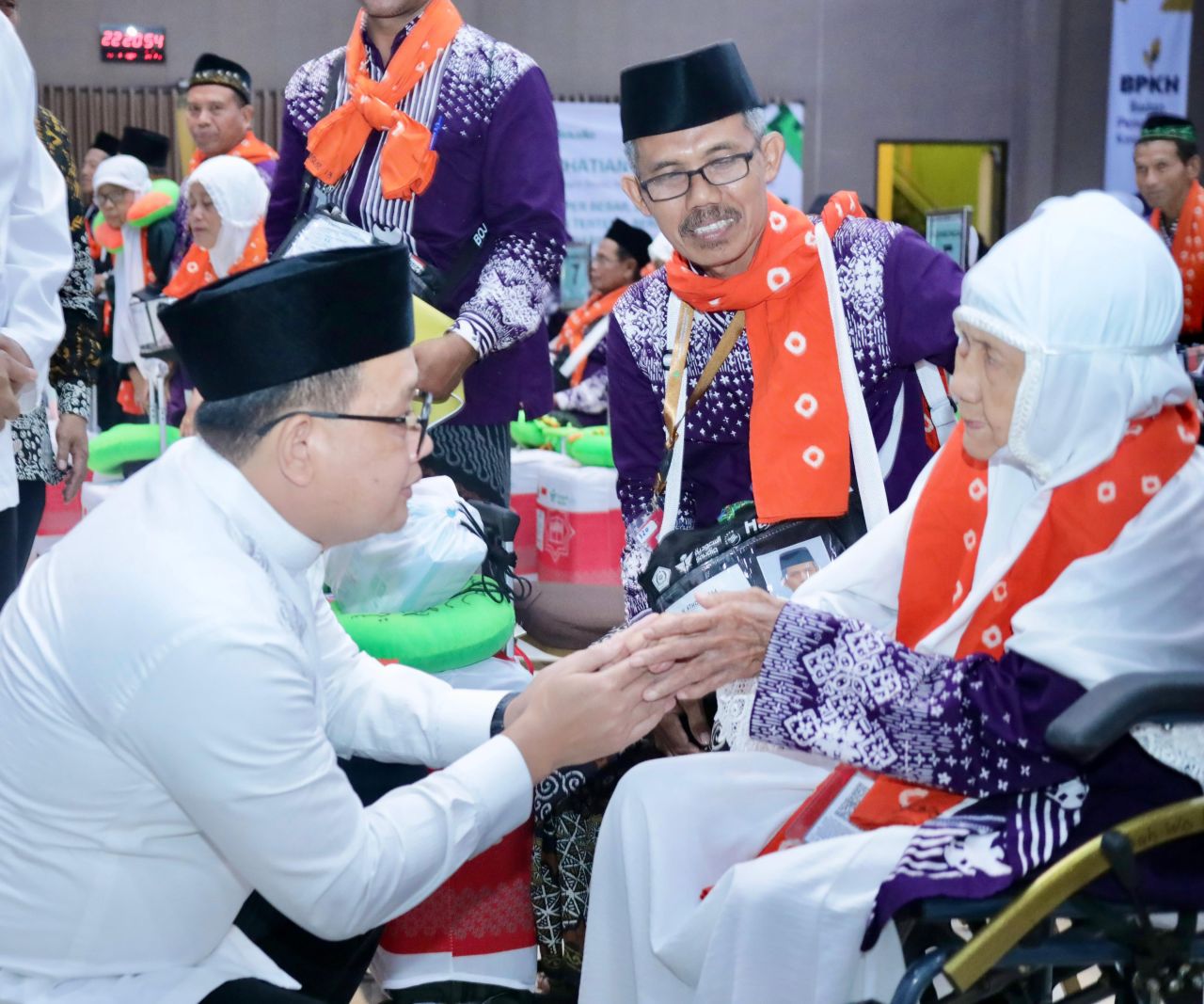 Salah satu jamaah lansia yang berusia 86 tahun dari Bojonegoro bernama Satam berangkat didampingi anaknya Siti Kholifah Satam (56). Ketika disapa Pj. Gubernur Adhy, keduanya menyatakan kelegaan dan kegembiraan hatinya.