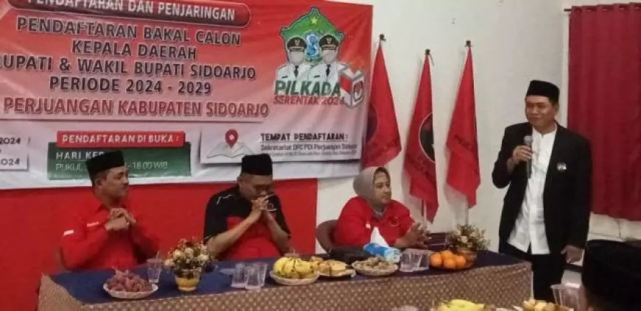 Sugiono mengatakan, bahwa ia telah menyerahkan berkas perlengkapan dan seluruh persyaratan pencalonan di DPC PDIP Sidoarjo. “Bismillah saya mendaftarkan diri menjadi calon bupati melalui PDIP,” ujar Ir Sugiono saat mengembalikan formulir pendaftaran ke kantor DPC PDIP Sidoarjo bersama timnya yang merupakan warga perumahan Puri Surya Jaya Gedangan Sidoarjo, Minggu (19/5/2024).