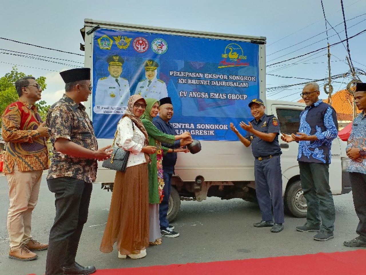 GRESIK | B-news.id - Bupati Gresik Fandi Akhmad Yani melepas ekspor produk UMKM Songkok ke negara Brunai Darussalam. Pelepasan ditandai dengan pemasangan segel tanda pengaman dari Bea Cukai Gresik dan pemecahan kendi oleh bupati. Pelepasan digelar di kawasan Bandar Grissee di Jalan Basuki Rachmat Gresik, Kamis (27/06/2024).