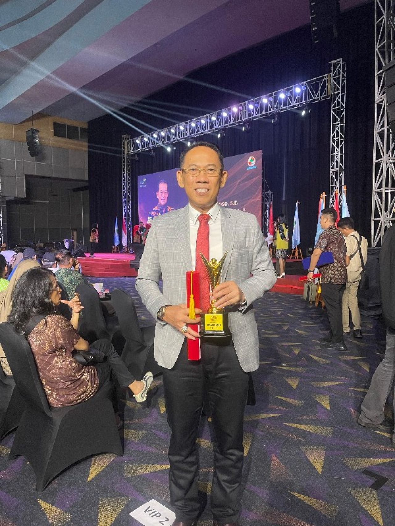 Gaguk Tri Prasetyo yang mewakili Pj Wali Kota Mojokerto memamerkan penghargaan sebagai Pembina Koperasi Andalan. (ist)