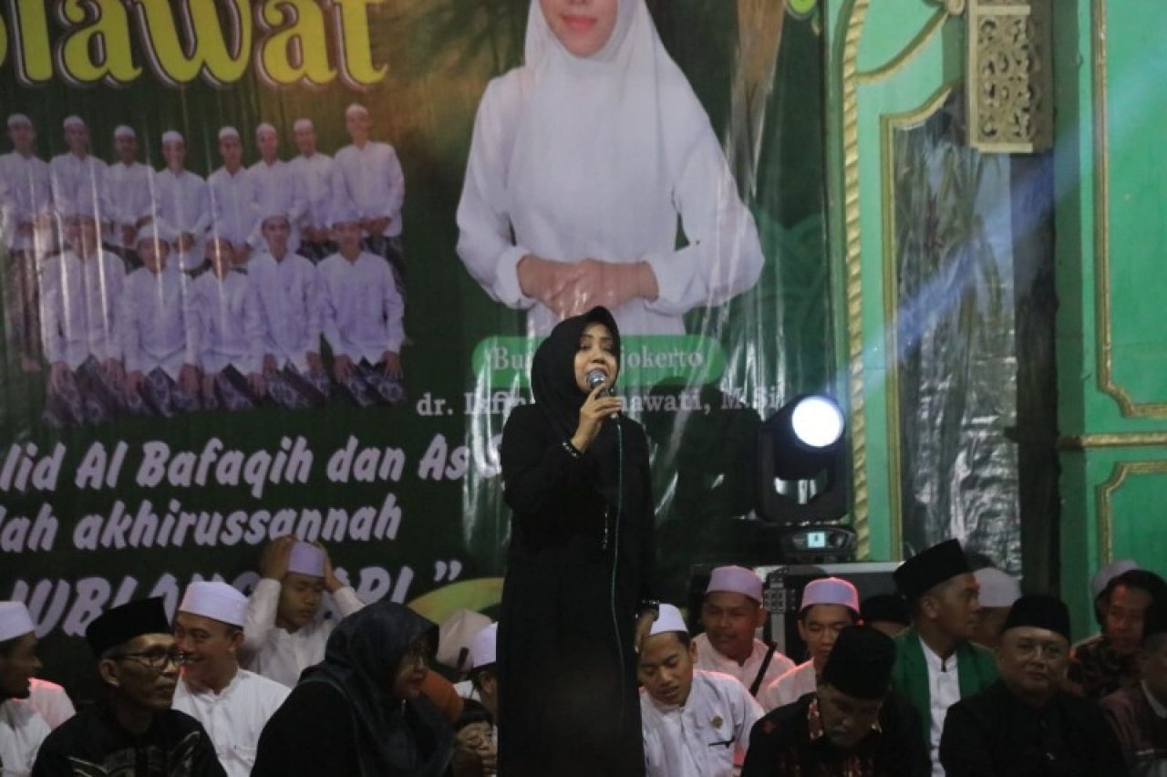 KABUPATEN MOJOKERTO | B-news.id - Bupati Mojokerto Ikfina Fahmawati berkesempatan menghadiri Pengajian Umum dan Sholawatan yang diadakan dalam rangka wisuda santri TPQ Al Akbar Dusun Jublangsari Desa Simongagrok Kecamatan Dawarblandong pada Senin (15/7) malam.