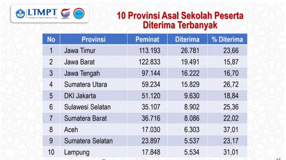 Dengan Jatim menduduki posisi teratas, jika dibandingkan dengan jumlah peserta yang diterima dari provinsi lain pun ternyata terpaut cukup jauh. Rincinya, di posisi kedua ditempati provinsi Jawa Barat dengan 19.491 peserta diterima.