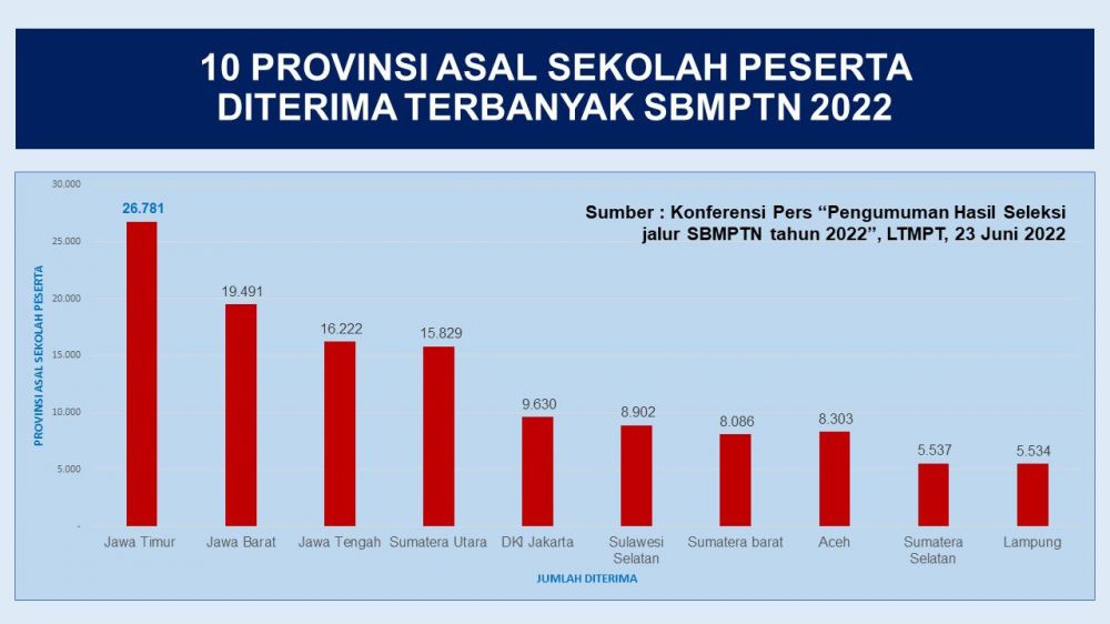 Jika diperingkat berdasarkan provinsi, Jawa Timur merupakan daerah dengan jumlah peserta terbanyak diterima dalam SNMPTN 2022 yakni sebanyak 17.807 siswa atau mencapai 20,15 persen dari total 88.375 pendaftar.