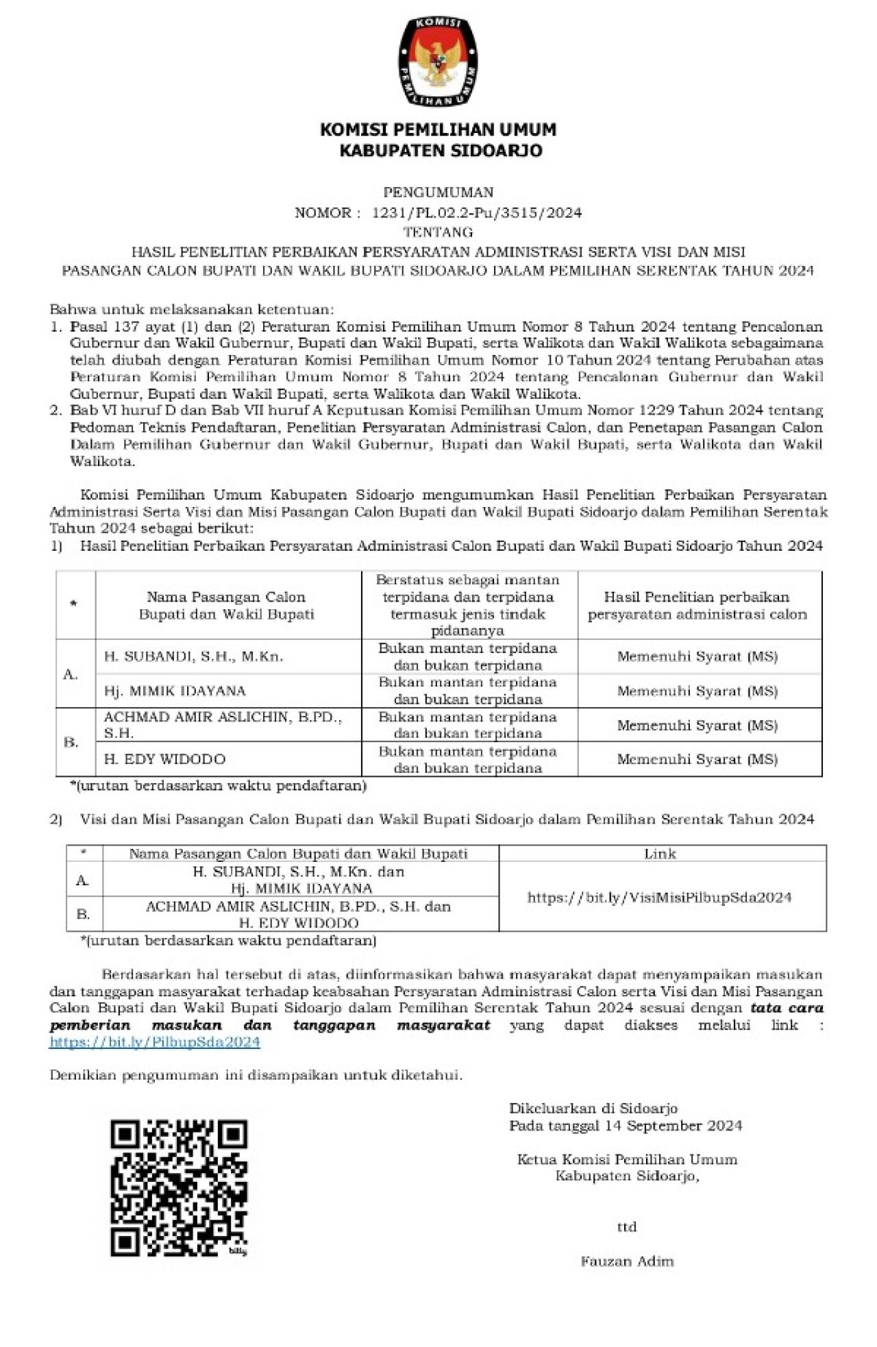 Pengumuman KPU Sidoarjo Hasil Penelitian Perbaikan Persyaratan Administrasi Serta Visi dan Misi Paslon Bupati dan Wabup Sidoarjo Dalam Pemilihan Serentak 2024