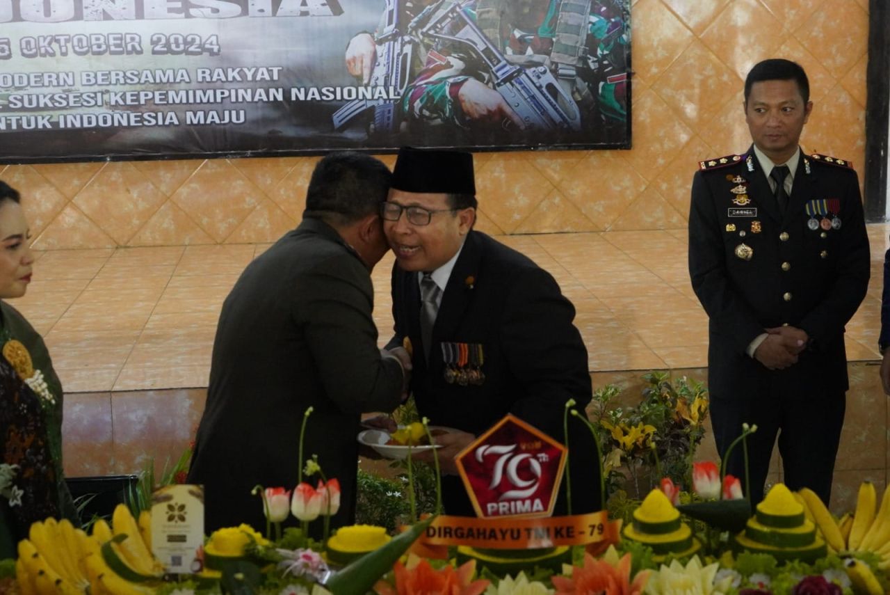Pjs Bupati Mojokerto Akhmad Jazuli memberi ucapan selamat kepada Danrem 082 CPYJ Kolonel Inf Heri Rustandi pada HUT TNI Ke-79. (ist)