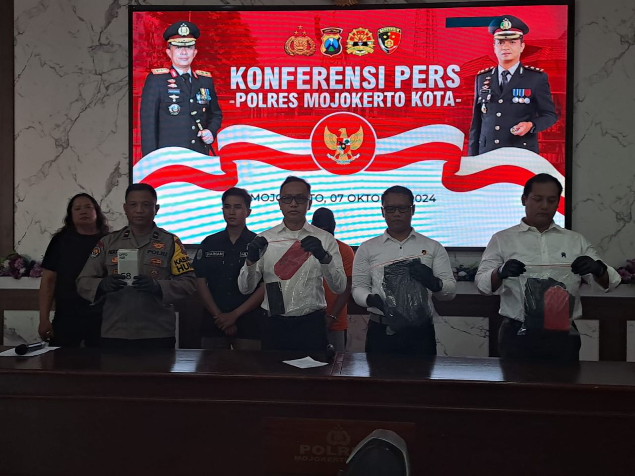 KOTA MOJOKERTO | B-news.id - Satuan Resimen Kriminal (Satreskrim) Polres Mojokerto Kota menggelar konferensi pers terkait pengungkapan dua kasus tindak pidana, yakni satu kasus pencurian dengan pemeberatan (Curat) dan satu kasus lagi pencurian dengan kekerasan (Curas) alias Jambret di Aula Hayam Wuruk Polres Mojokerto Kota pada Sanin (7/10) siang.