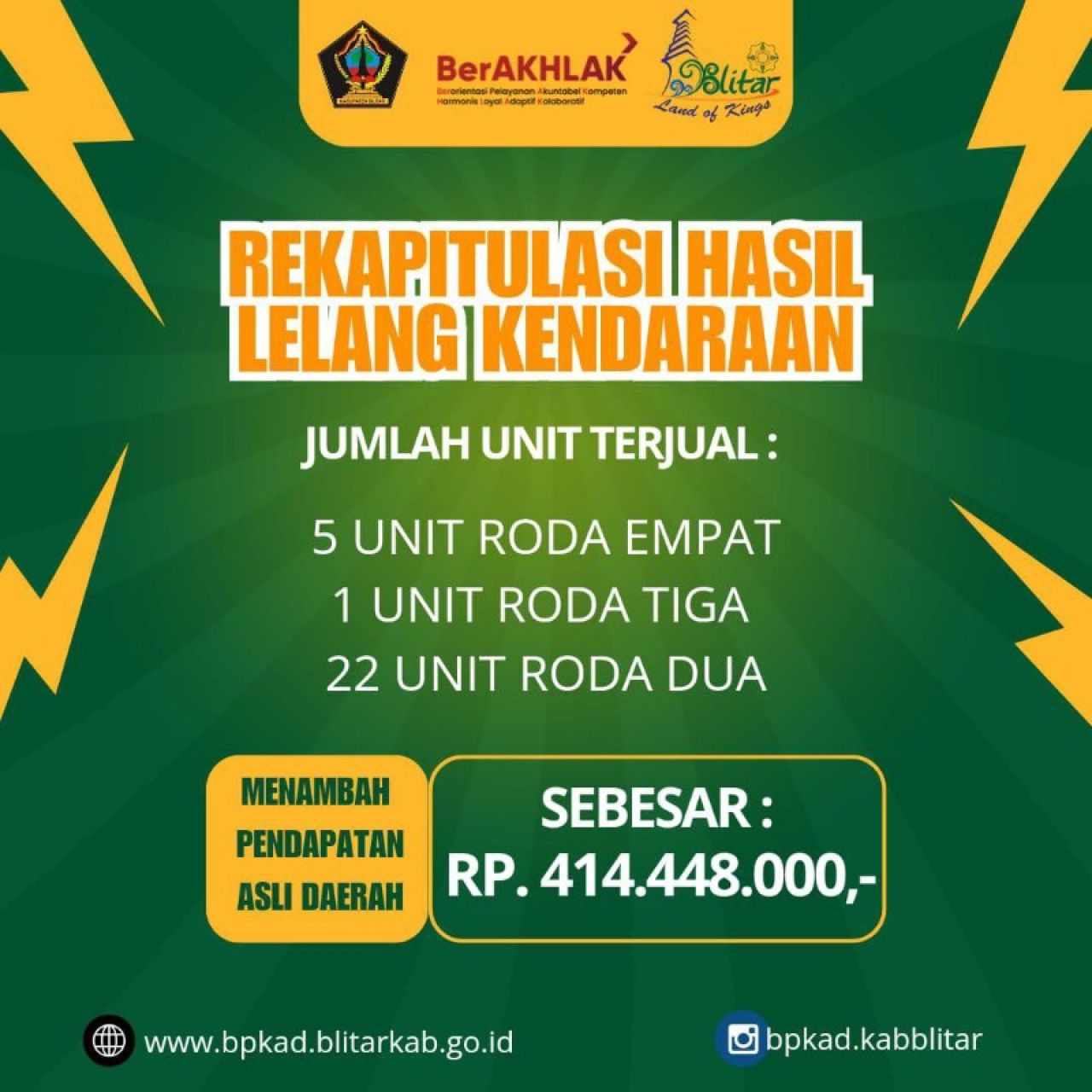 Kepala BPKAD Kabupaten Blitar, Kurdiyanto, SE.MM melalui Kepala Bidang Pengelolaan Aset Daerah, Ahmad Saik, SE.MM, menjelaskan bahwa kegiatan ini membuahkan hasil yang sangat memuaskan. Sebanyak 28 unit kendaraan berhasil terjual dengan total nilai Rp414.448.000.