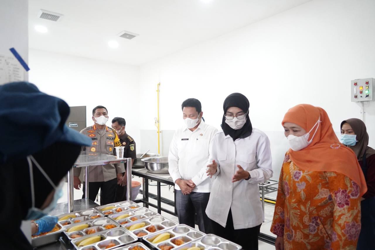 Saat meninjau dapur SPPG, Khofifah dan Subandi melihat langsung proses pengolahan bahan makanan yang dikelola dengan memperhatikan standar kebersihan tinggi.