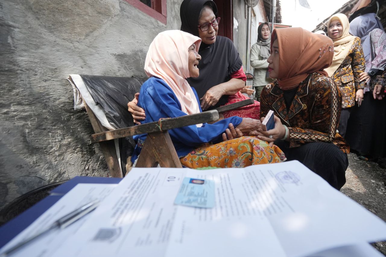 Ning Ita dengan akrab berkomunikasi dengan lansia penerima bansos. (ist)