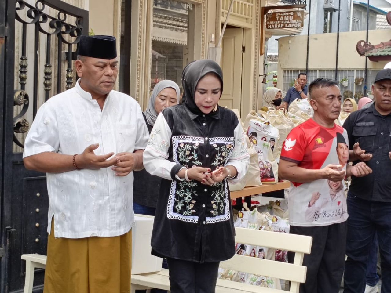Sebelum pembagian sembako H Rahmat Muhajirin dan Mimik Idayana mengamini doa. (foto: zainul/ B-news.id)
