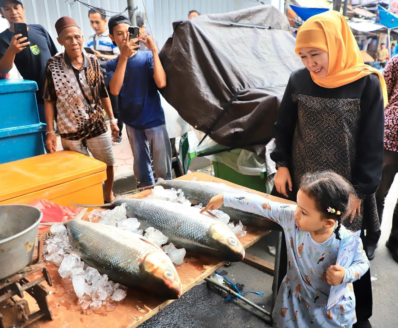 GRESIK | B-news.id - Gubernur Jawa Timur Khofifah Indar Parawansa bersama cucu pertamanya, Aisyah Nabila atau yang akrab dipanggil Aila mengunjungi Pasar Bandeng Gresik, Kamis (27/3).