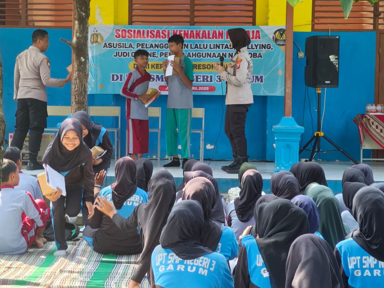 Acara dibuka secara resmi oleh Kepala Sekolah SMPN 3 Garum, Ibu Sri Suwarni, S.Pd., yang menyampaikan apresiasi dan rasa terima kasih atas kepedulian Polres Blitar terhadap pembinaan karakter siswa-siswi melalui kegiatan edukatif ini.