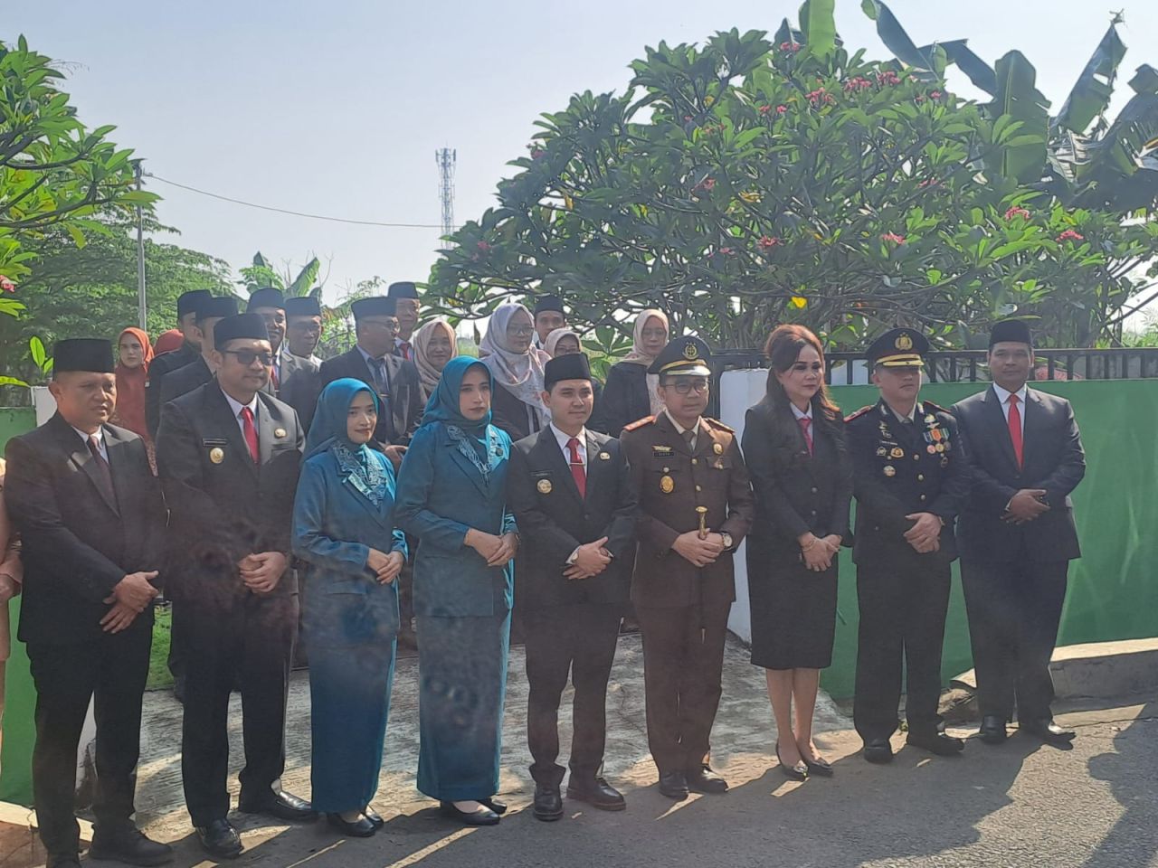 Bupati Gus Barra dan Wabup Rizal Oktavian foto bersama Forkopimda Kabupaten Mojokerto di depan makam H Suwandi dalam rangkaian Hari Jadi ke-732 Kabupaten Mojokerto. (foto: eko/B-news.id)