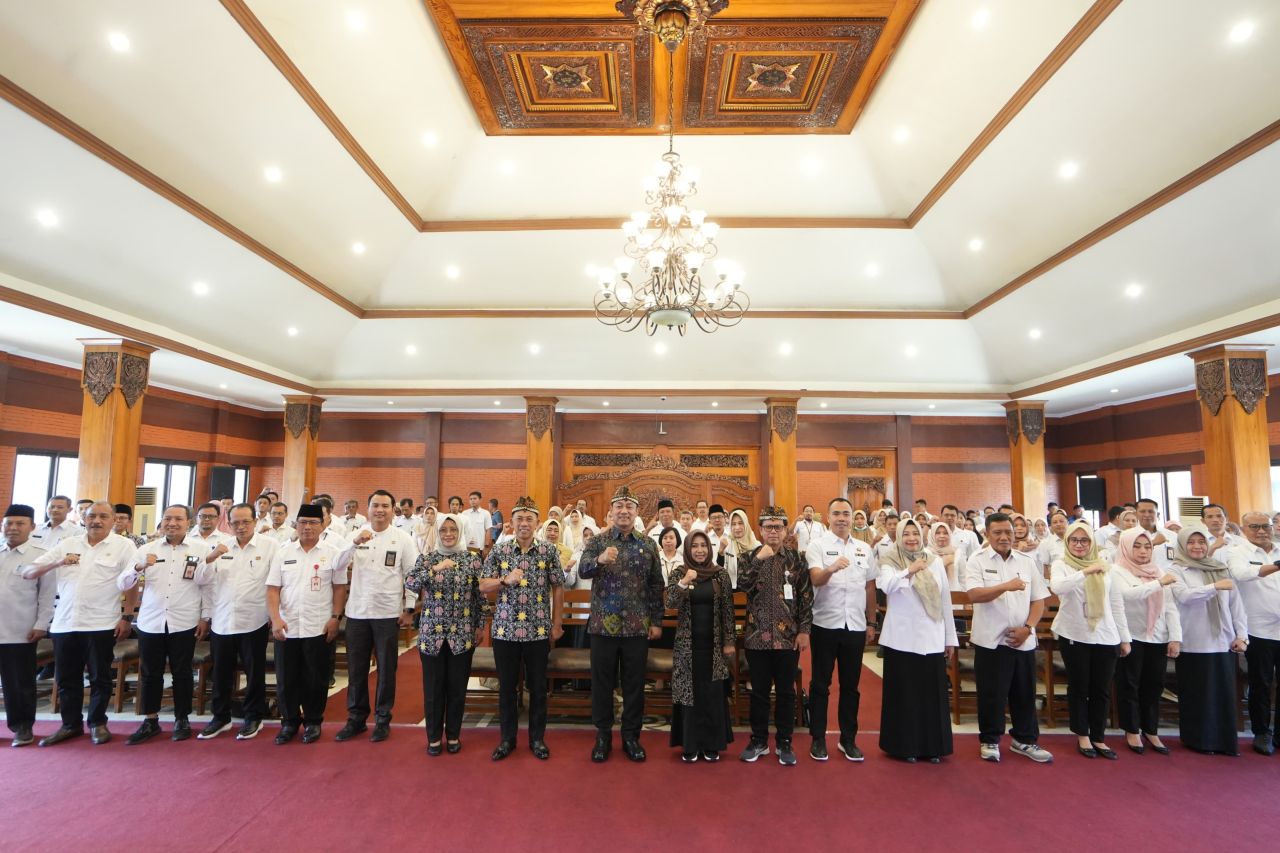 Ketua LKPP RI foto bersama Wali Kota Mojokerto dan peserta sosialisasi Perpres No.46 Tahun 2025 di Shaba Mandala Madya. (ist)