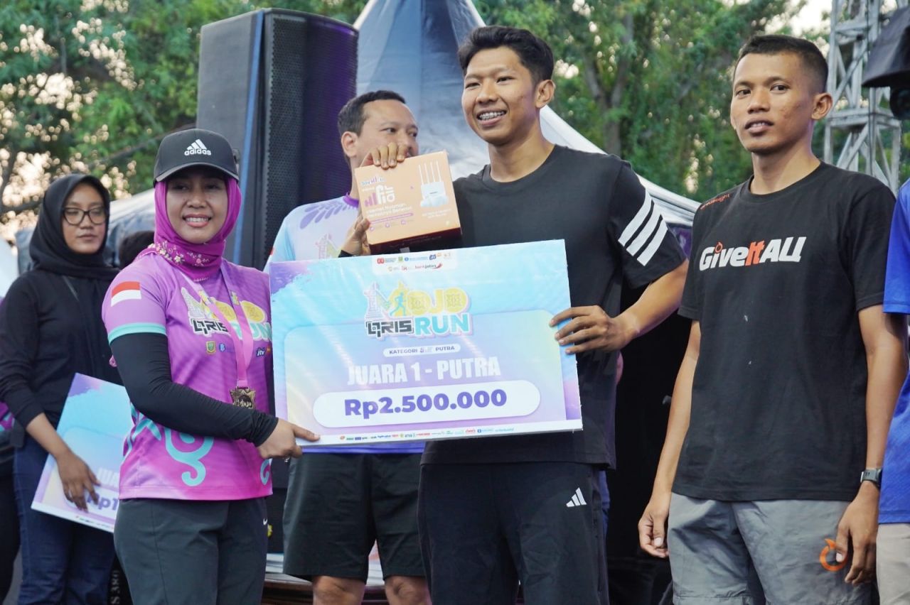 Wali Kota Mojokerto Ika Puspitasari menyerahkan hadiah kepada pemenang lomba lari Mojo Qris Run. (ist)