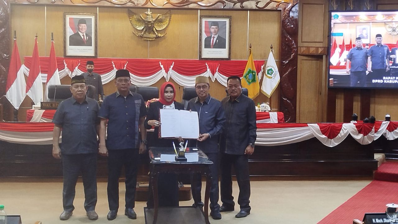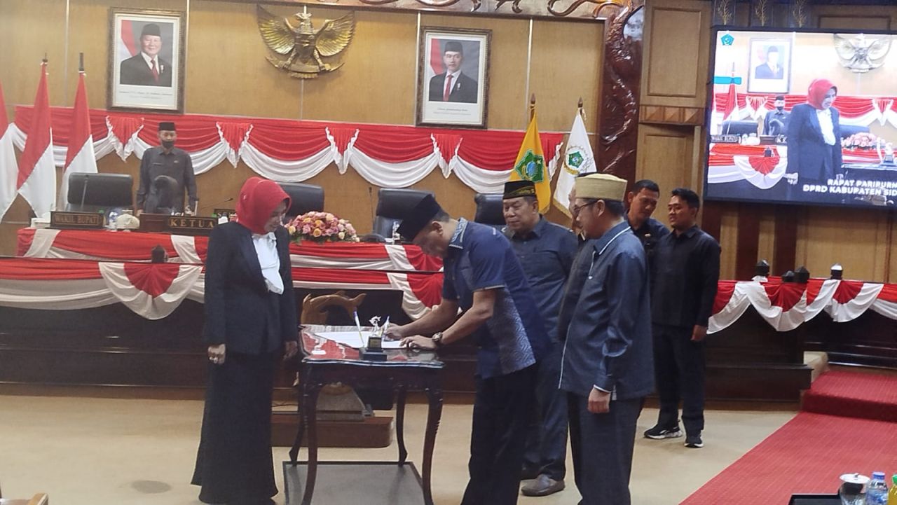 Penandatanganan berita acara kesepakatan bersama antara Pimpinan DPRD Kabupaten Sidoarjo dengan Bupati Sidoarjo diwakilkan Wakil Bupati Sidoarjo Hj. Mimik Idayana divruang didang DPRD Sidoarjo. (foto: zainul/B-news.id)