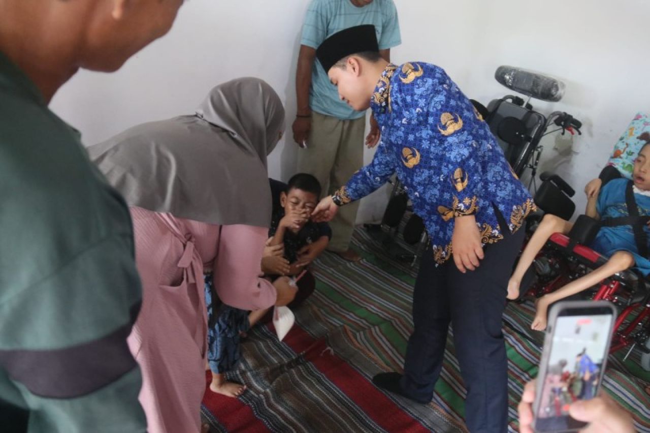 KABUPATEN MOJOKERTO | B-news.id - Gus Bupati panggilan akrab dari Bupati Mojokerto Muhammad Albarraa berkesempatan menyerahkan secara langsung bantuan kursi roda kepada Yudhistira Putra Andika dan Surifan Harianto, dua anak penyandang disabilitas dari Desa Modopuro, Kecamatan Mojosari pada Rabu (17/9) siang.